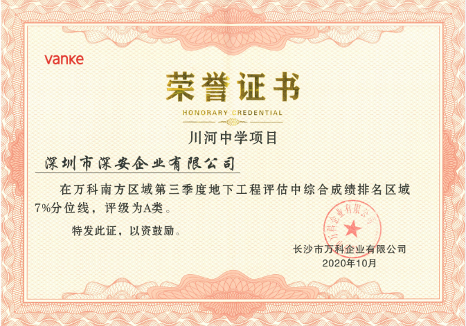 近日,深安企業(yè)長(zhǎng)沙川河中學(xué)項(xiàng)目在萬科南方區(qū)域第三季度地下工程評(píng)估中綜合成績(jī)排名區(qū)域7%分位線,評(píng)級(jí)為A類。